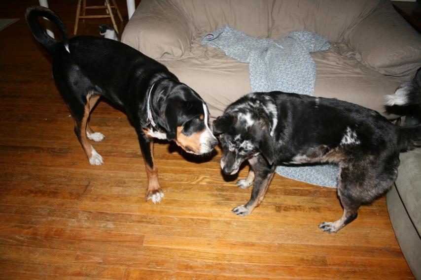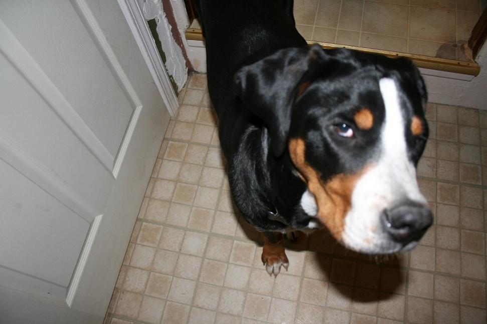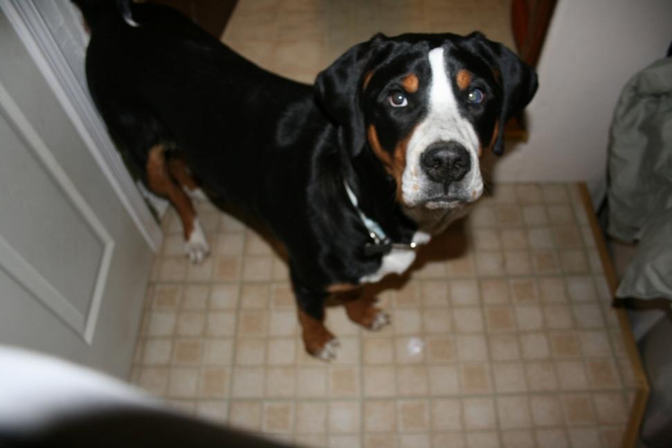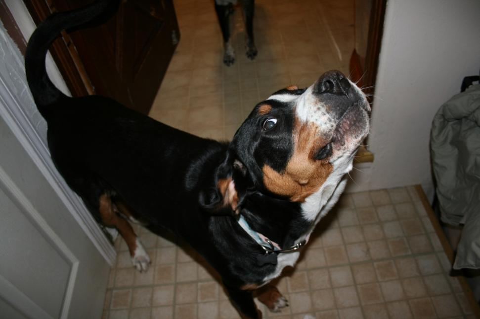 ![]() First one is her about to bark. She found my camera flash quite suspicious. Third one she's staring at the camera suspiciously. Greater swiss mountain dogs are suspicious of everything lol. |