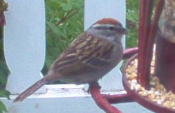 According to http://www.leo.lehigh.edu/projects/b...mallbirds.html , it's a "Chipping Sparrow". Their website states: "Chipping Sparrow Spizella passerina (Emberizidae) Cool Fact- Once among the most common birds in North America this bird declined sharply in the early 20th century. This was most likely due to competition House Sparrow which was becoming more common. Also increase agricultural activity created more habitat for cowbirds which then increasingly parasitized the nests of these birds. Chipping Sparrows have been known to steal hair from dogs and horses to use in their nests. Field Marks- A tiny, gray-breasted sparrow (significantly smaller than Song and House sparrows) with a bright rufous cap, a white line above the eye, and a black line through the eye. Occurrence Status- Breeding Bird"