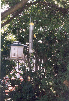 I have 3 feeders,including a Finch-feeder,right now I am looking at 3 Gold-Finches...I love birdwatching and checking them out in my book. Here's a not so good picture of"my"finches