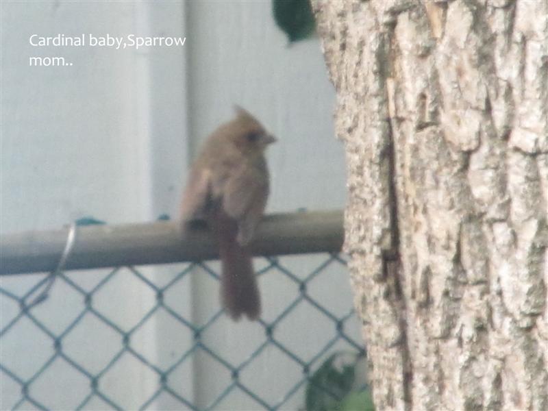 Good little sparrow mom. 'Her' baby is gorgeous. Keep trying please, Chico, I have no idea of the Cardinal's size. Is it already bigger than the sparrow, or not?