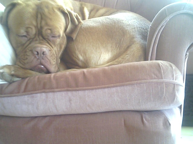 My sister has great danes, I myself, have Dogue De Bordeauxs. I see both dane and mastiff in your puppy`s face. The stubborn streak is common in both breeds, but the aloof nature you talk about is very typical in Mastiffs. The big softies. LOL No matter what mix she is ........... she is a real pretty girl. Here are some pics of my mastiffs for you to compare faces. I definately see mastiff in her. Also, as for her sitting on her side instead of straight up, my female Mastiff has done that all her life and she does not have hip dysplasia, I think she does it because it is easier to flop down for another nap that way.