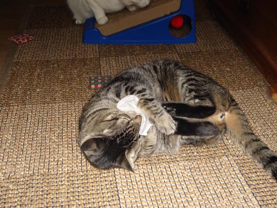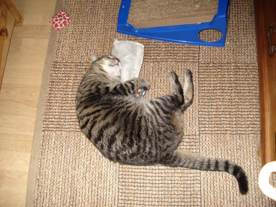 Our newly rescued addition, Feather, he didn't know what to make of it at first (he's very young by comparison). At first he just watched the other two rolling about and seemed quite alarmed. Then he tried it - it was really funny, the other two are so active but the first time Feather had it he was in slow motion. If he could speak it would have been like HAL at the end of 2001. "Shall I sing you a song, Dave? It's called... Daisies." Feather's first catnip experience: ![]() Now he's more or less like them, they twirl and twirl on the floor. Here's the other two ... Zotz is twirling her way to a higher plane of existance: