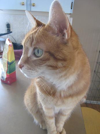 It was 13 years ago when I went the the human society in Sault Ste. Marie, ON to pick out a kitty. I knew I wanted an ornage one, and when the lady opened his cage he came out strutt'n his orange junk across the room, climbed up on me and started kneeding and purring. I was sold. Game over. I took him home, opened the cage, and out walks Pubert...DH noticed what I hadn't, he had extra toes, 6 on the front, 7 on the back..."what is that?" he says...a cat of course. Then I noticed the toes, so strange and unusual, but oh so cute.
