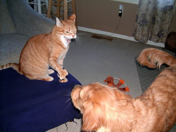 He loved to swat thats for sure!! He would wait in the hallway when we had parties and he's raise his paw up like a high five and people would say..."aw, he's so cute"...then he'd kung foo them, most people would freak out expecting it to be clawed to death, but he had no claws (not my doing). He would even swat grandma! And he'd run at Dazy swattn her chops backing her inthe corner, when she went belly up, he'd clean her ears! LOL!